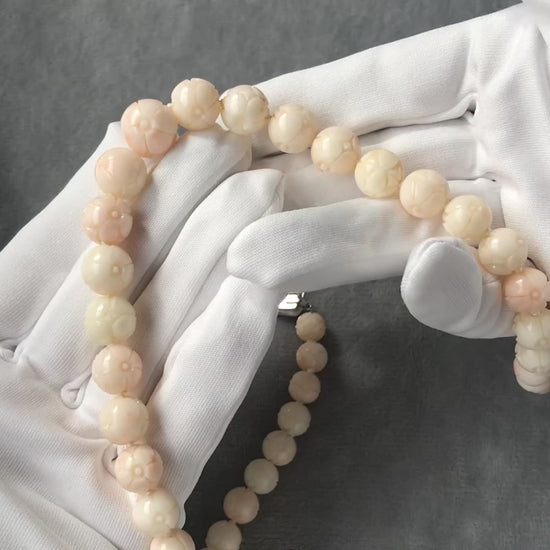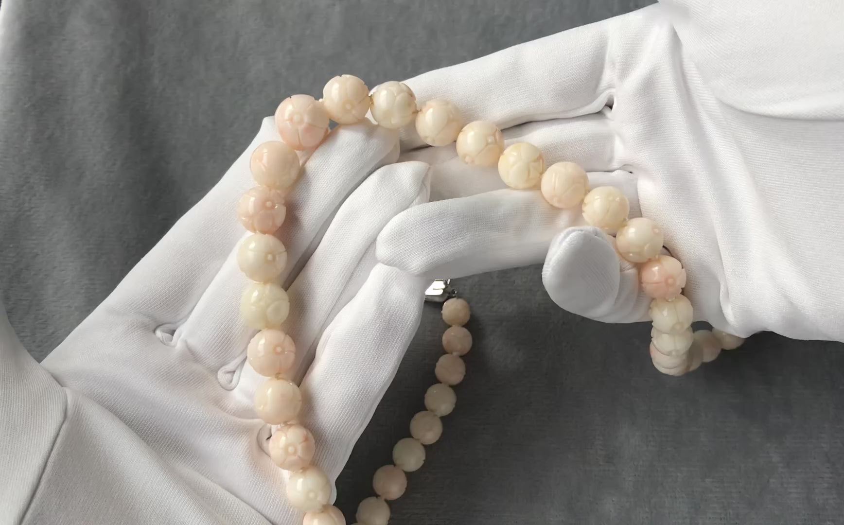 This necklace consists of beads that are each carved in a cherry blossom design on both sides of the bead.