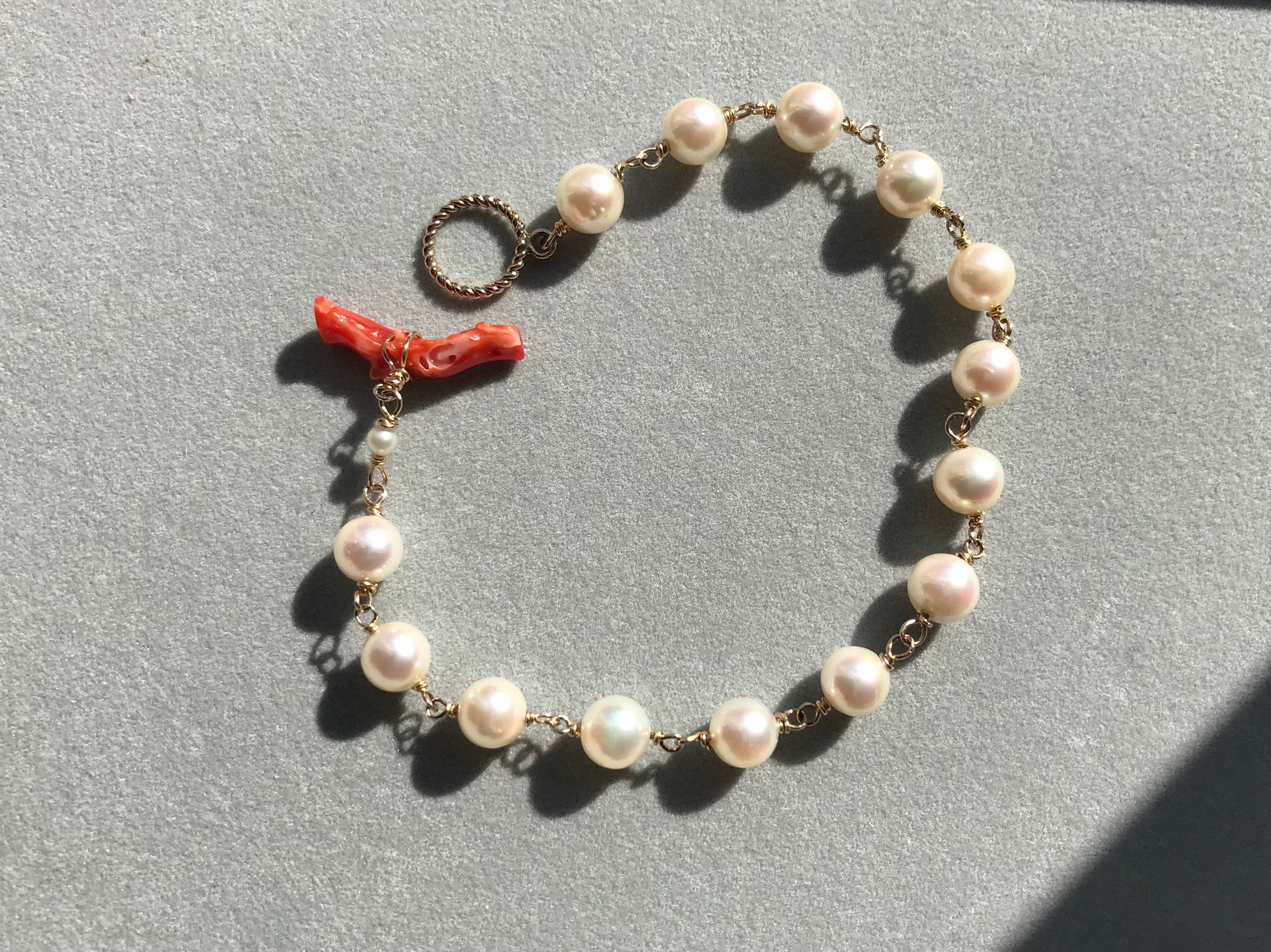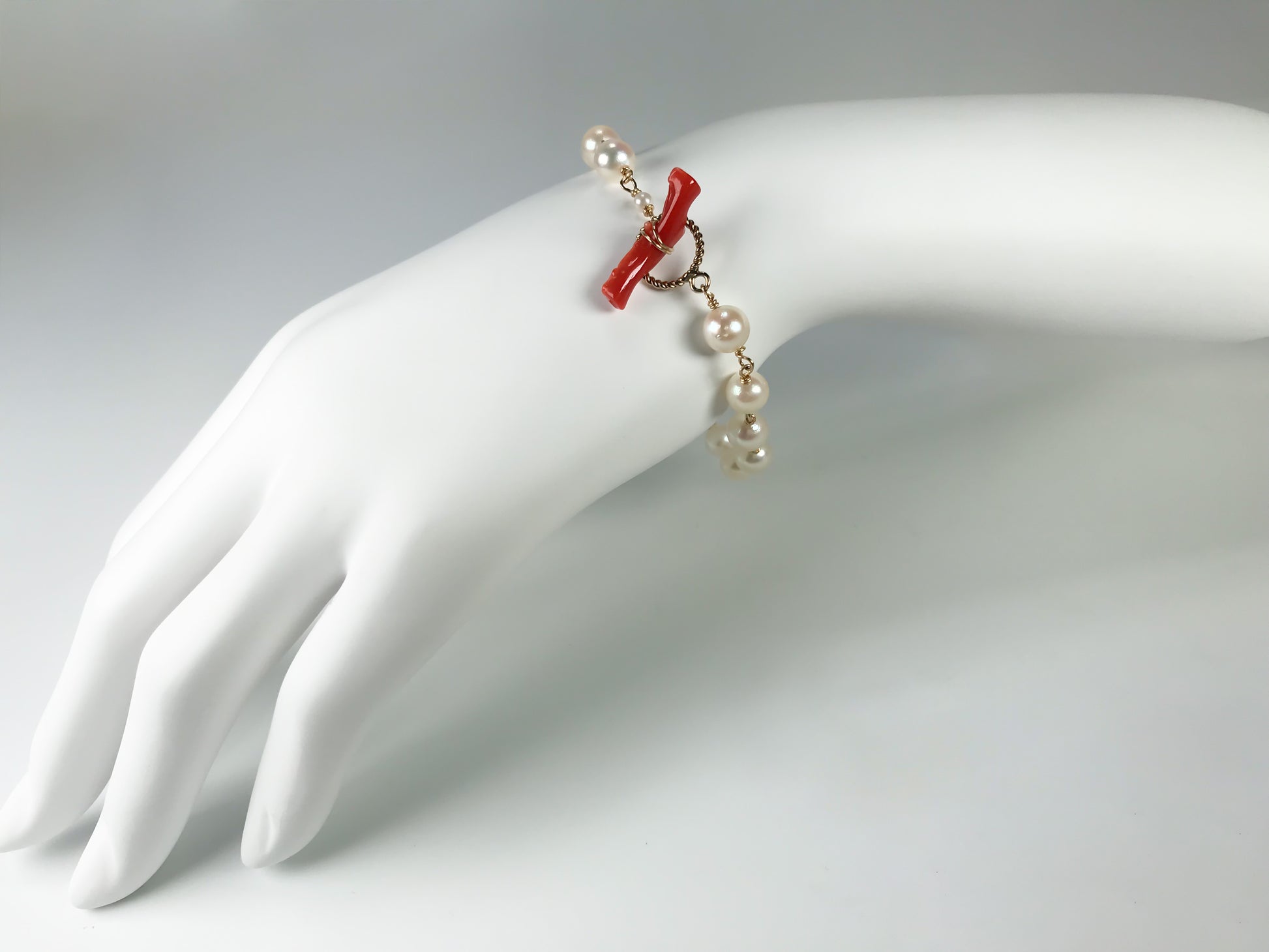 Japanese Akoya salt-water pearl bracelet with blood red coral branch.