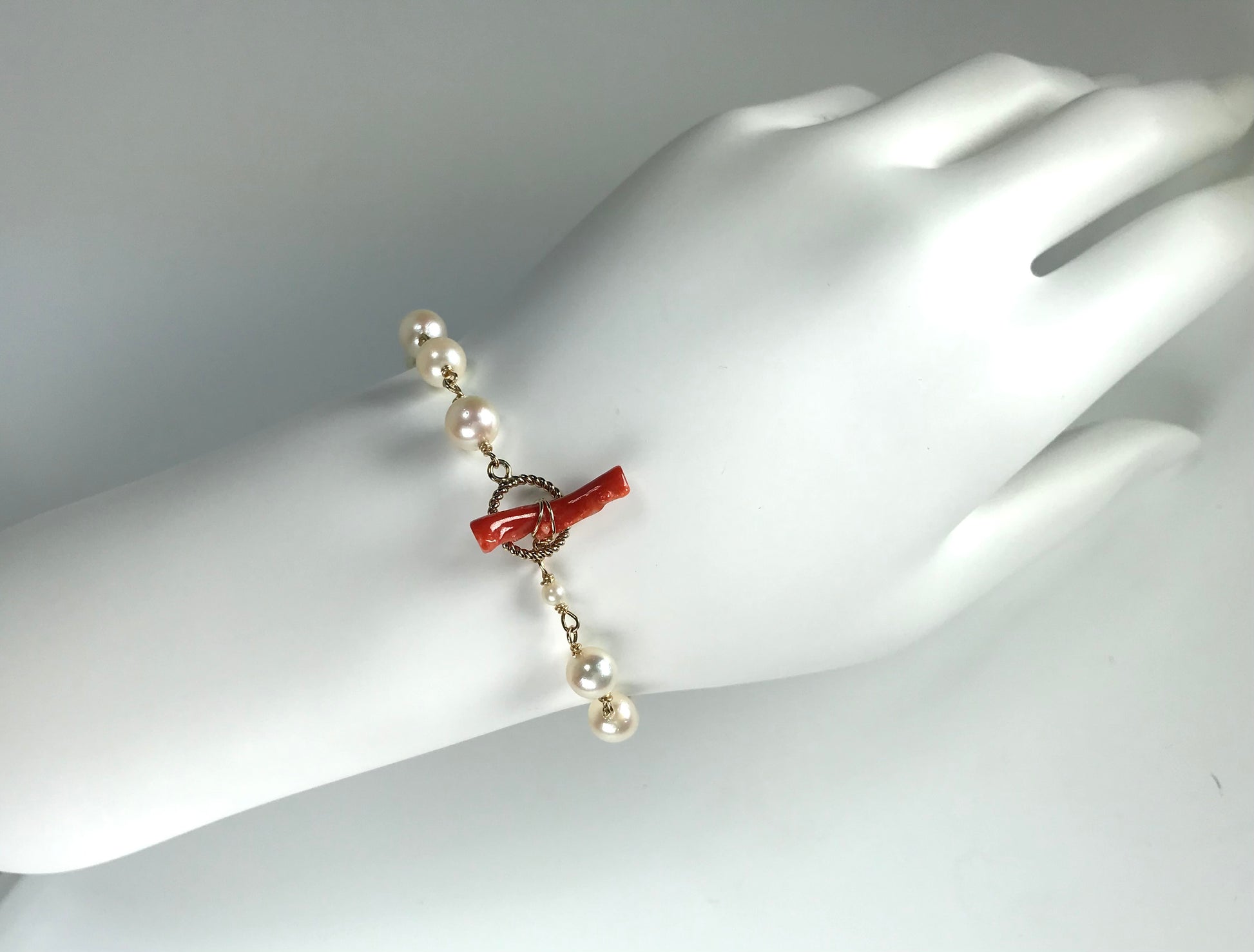 Akoya pearl bracelet 14K gold filled toggle ring with blood red coral bar