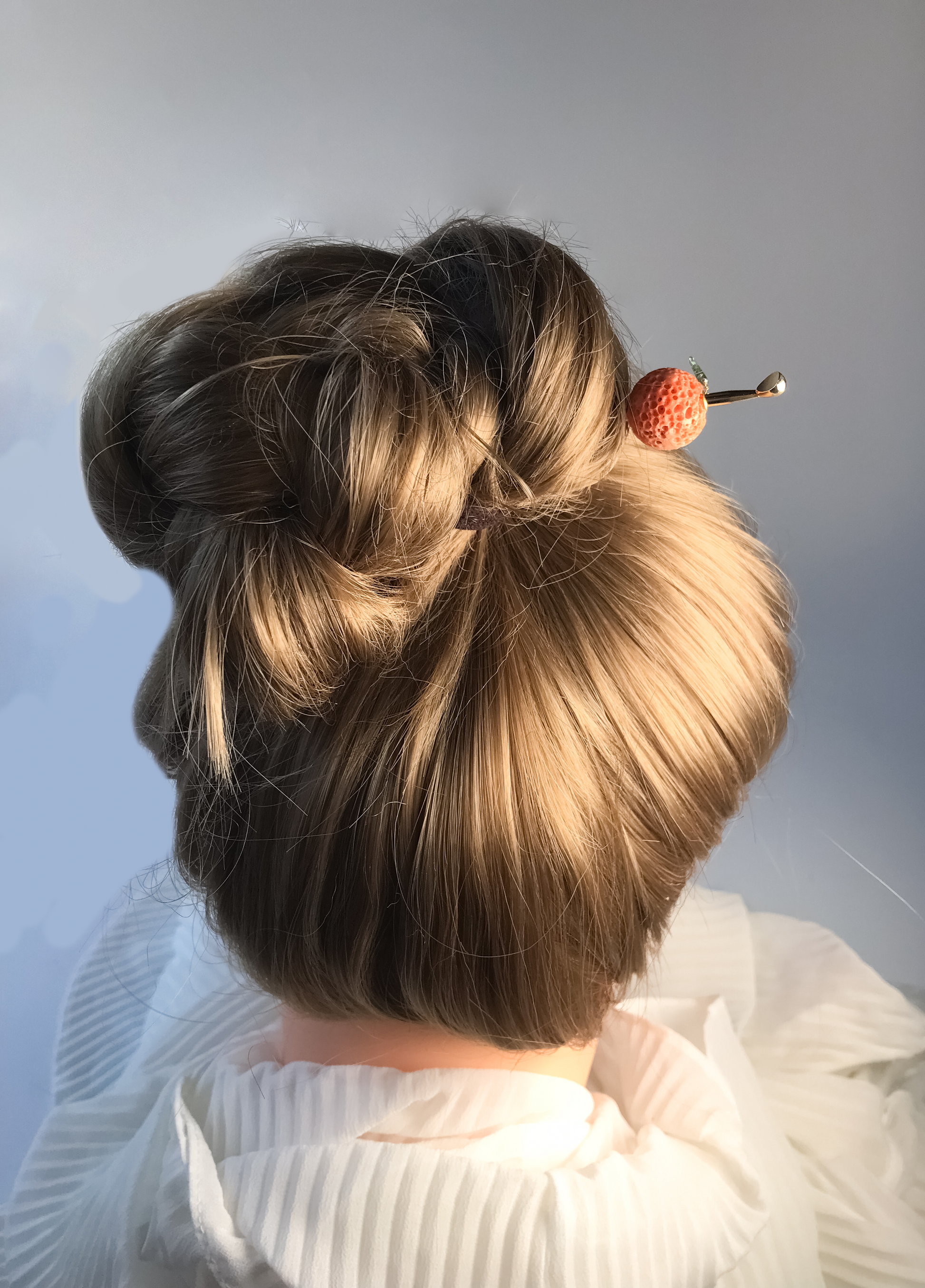 The Kanzashi fork (metal part) was made by an established Kanzashi craftsman in Tokyo, whose workshop has been active for more than 100 years. He mostly makes hair ornaments for traditional Japanese performing artists, such as Kabuki and Japanese dance performers.
