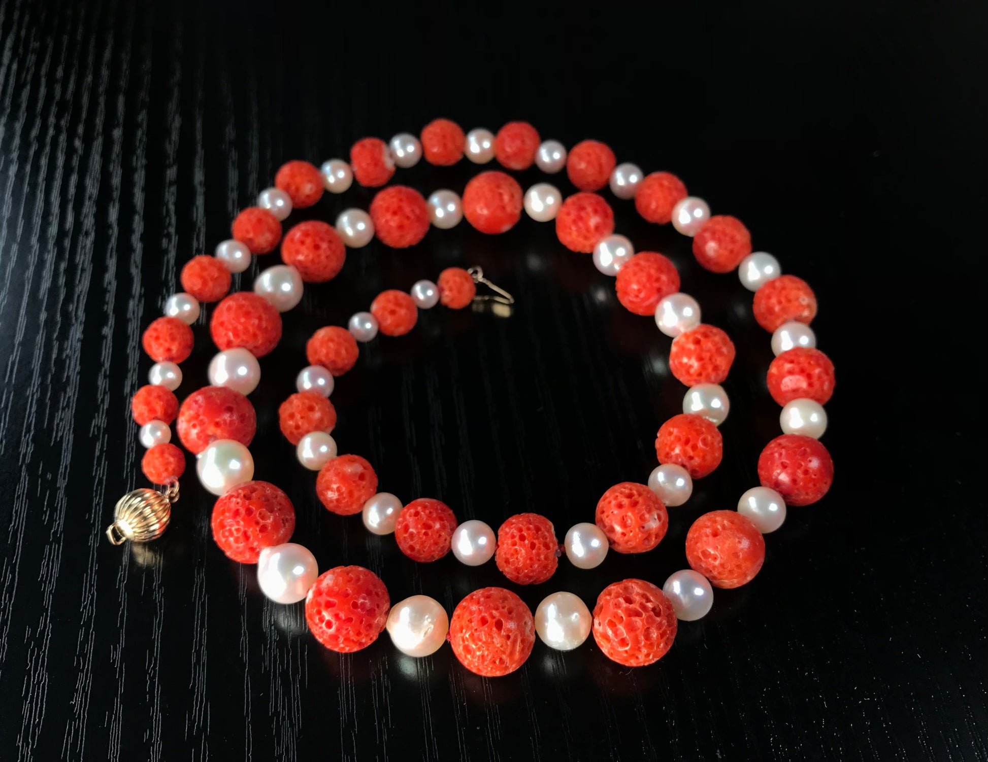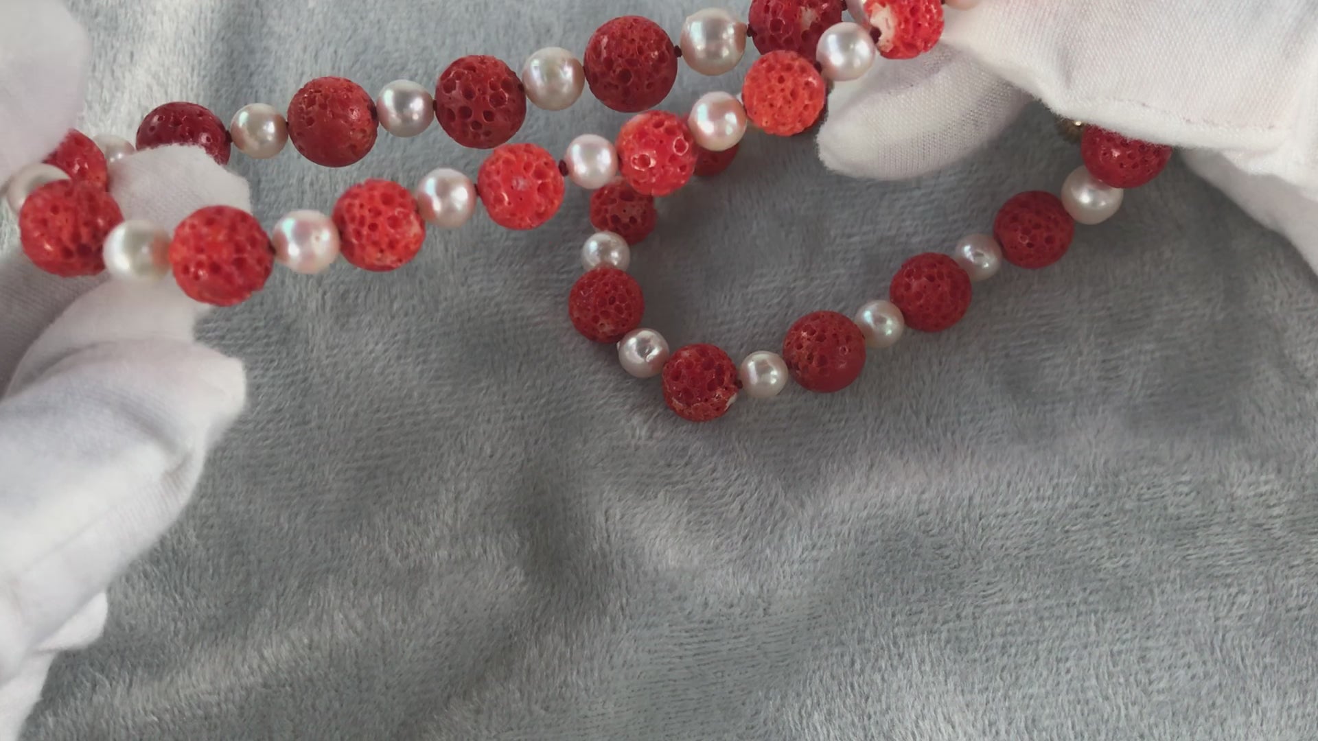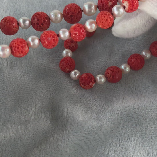 This is a Japanese red (Aka) coral and Akoya pearl necklace.