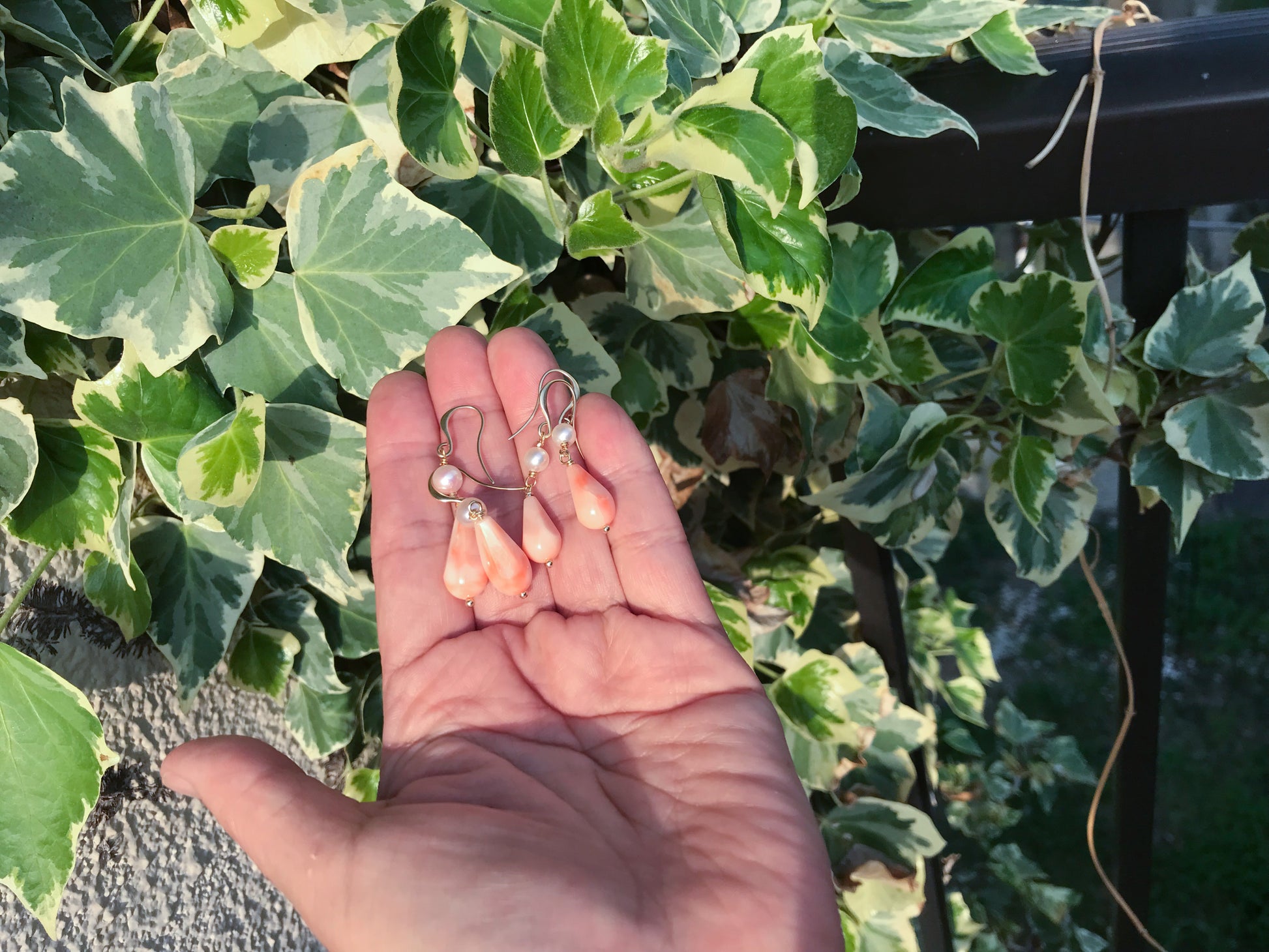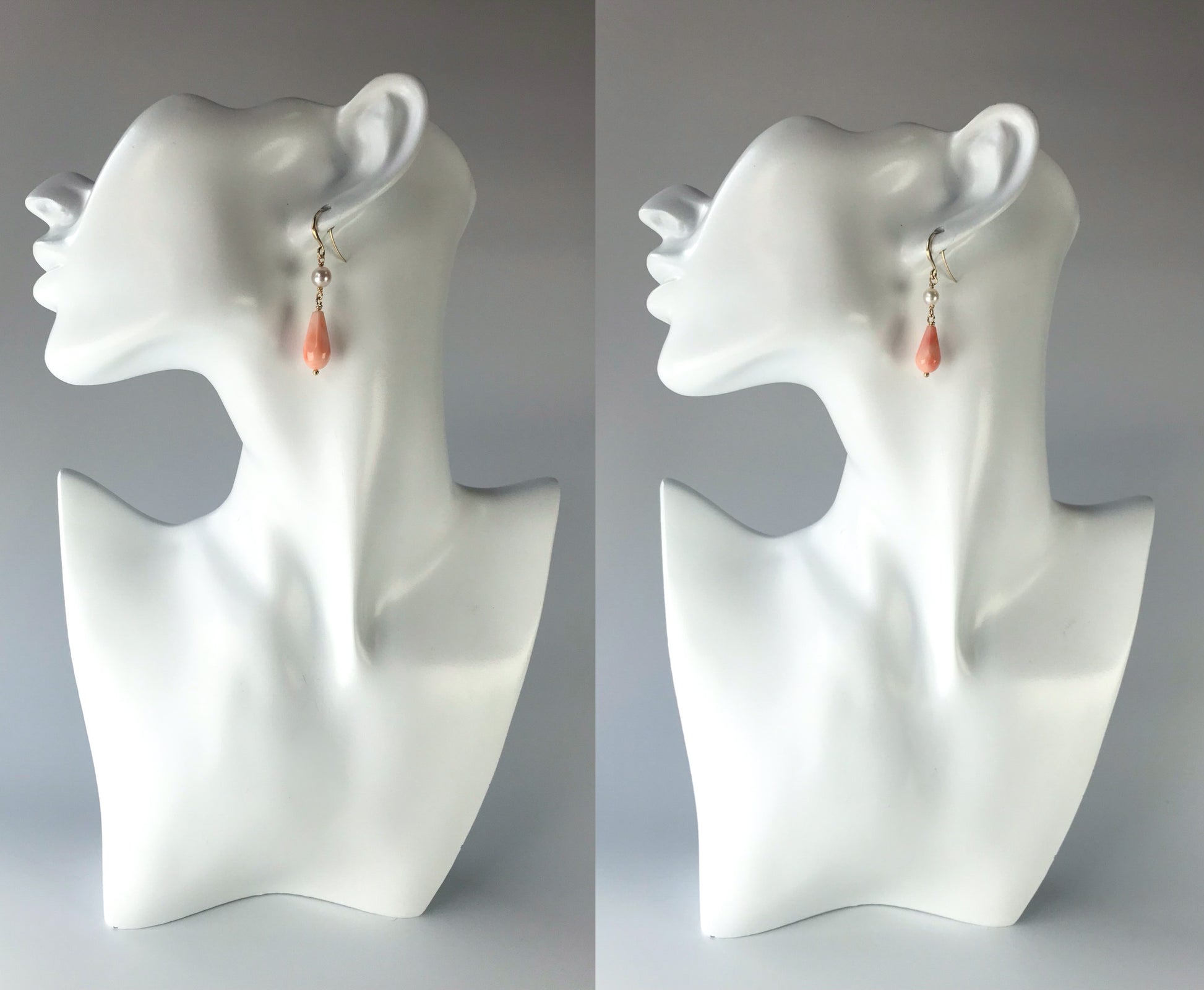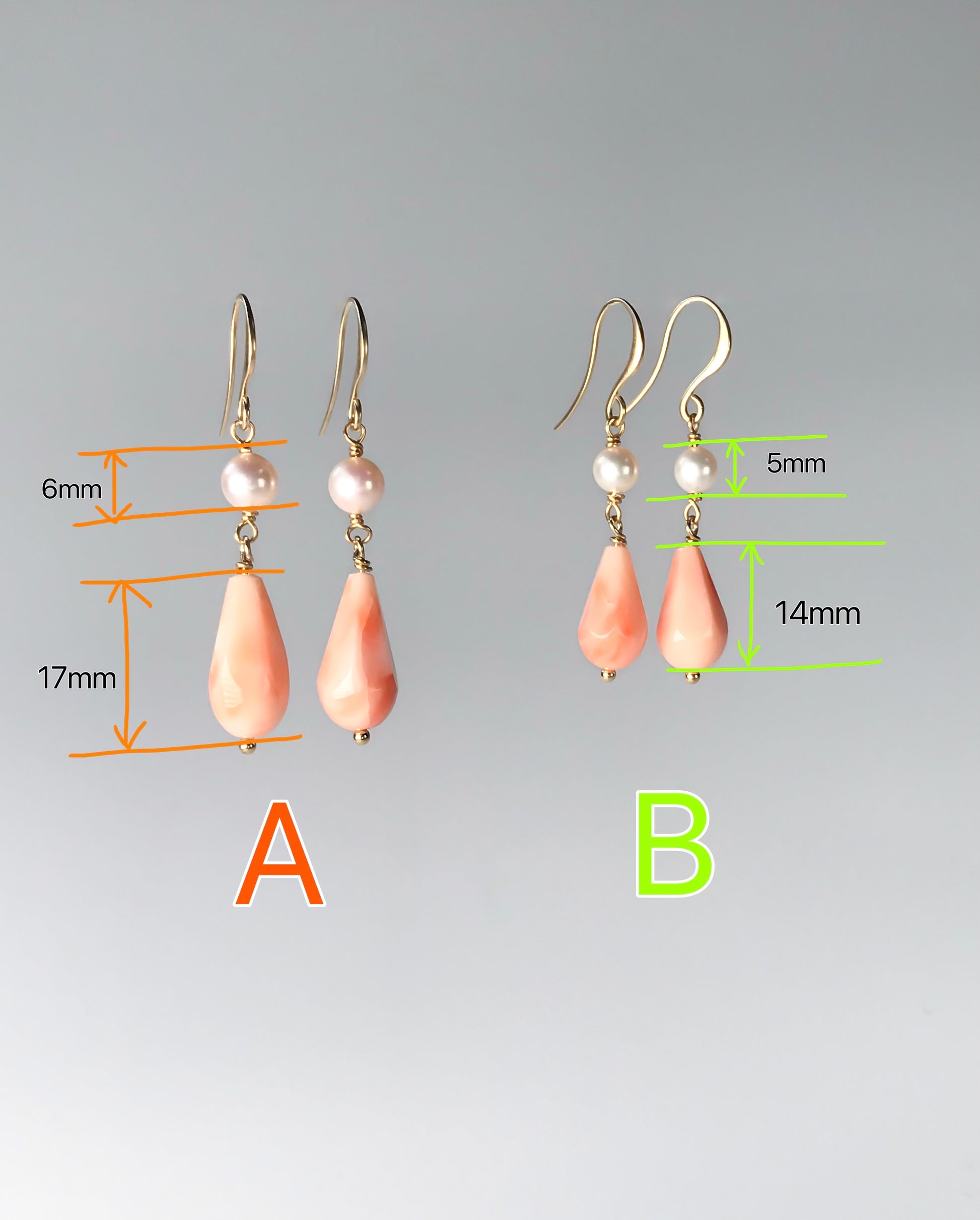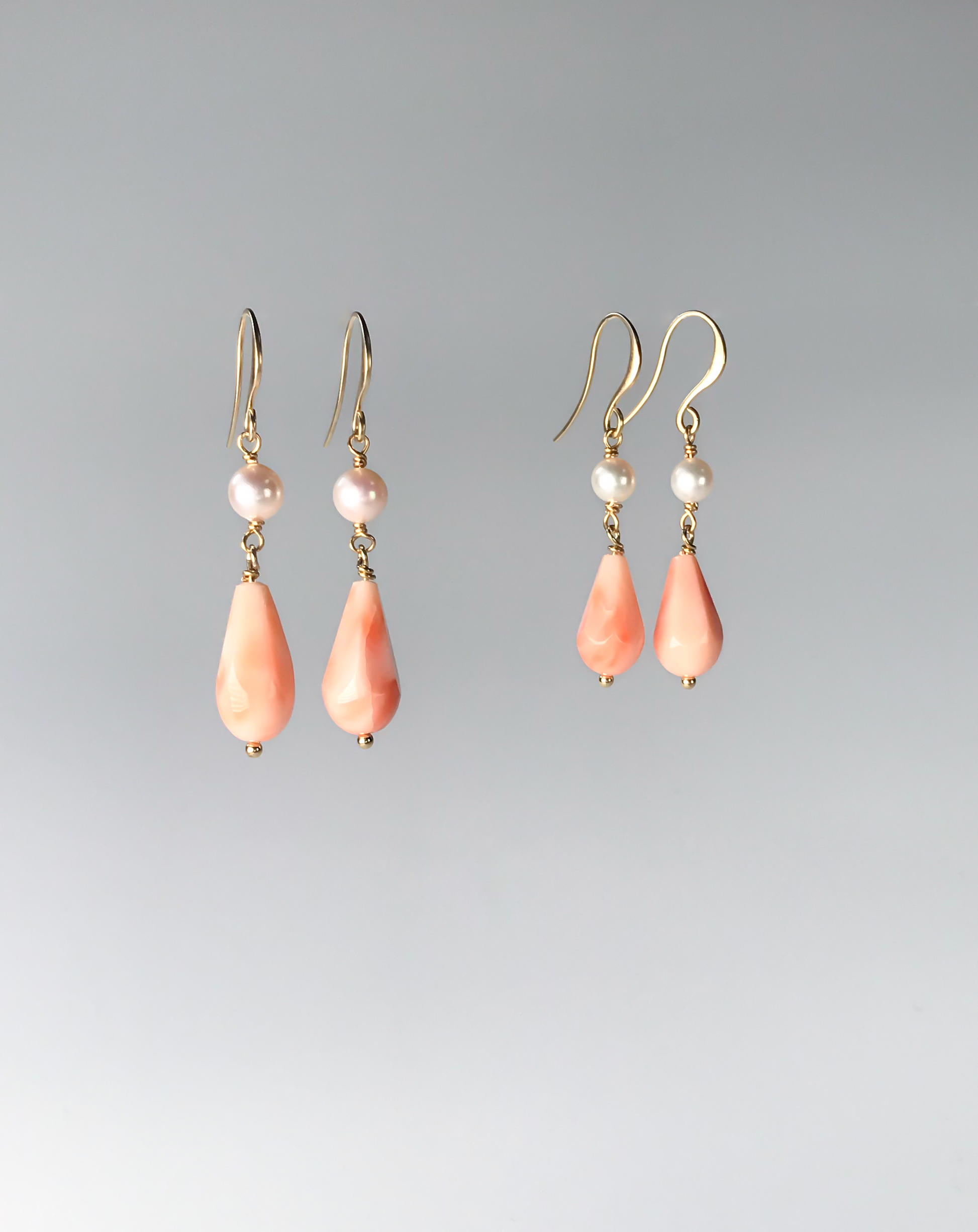 Earrings featuring vintage Japanese pink coral pear shape beads and Akoya pearls (Japanese cultured salt water pearl).