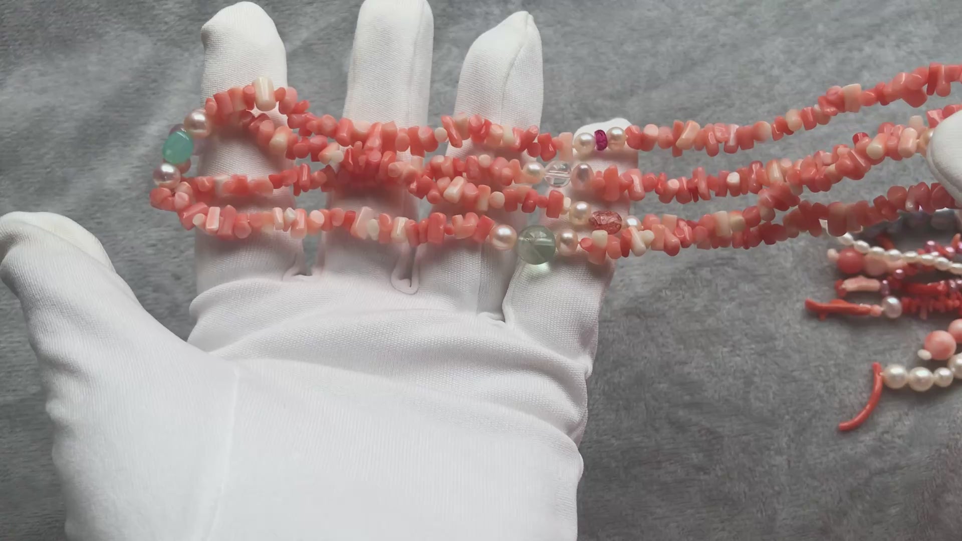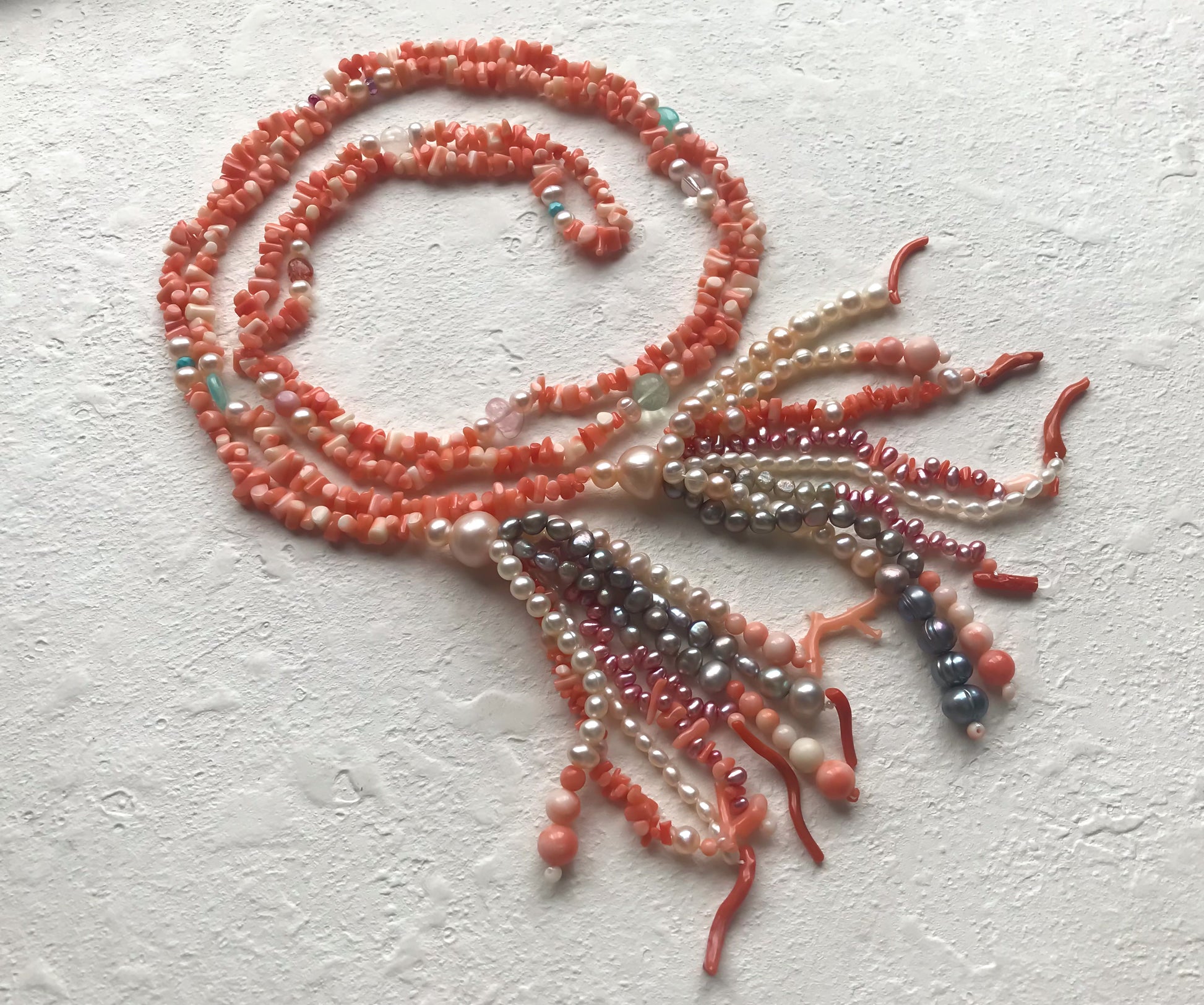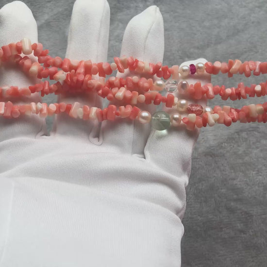 The necklace consists of coral beads, fresh-water pearls and multiple gemstones (ruby, sunstone, amethyst, turquoise, blue opal,moon stone, morganite, fluorite.)