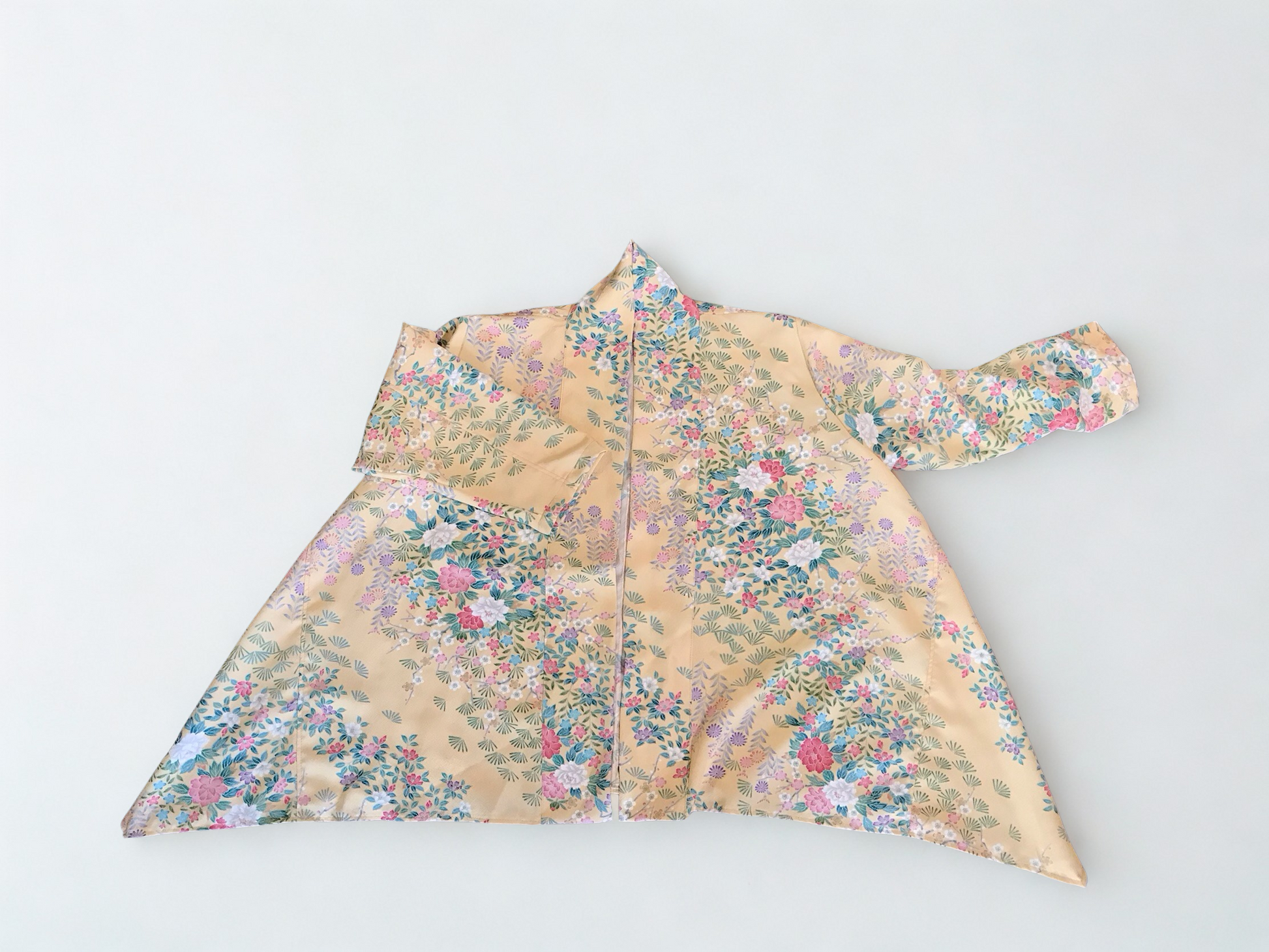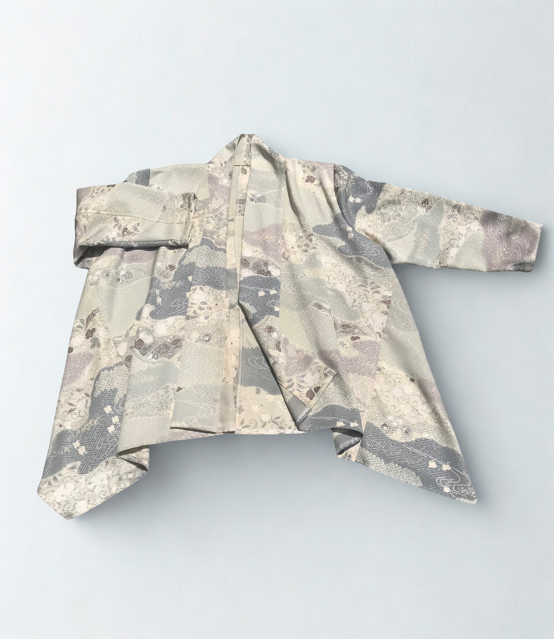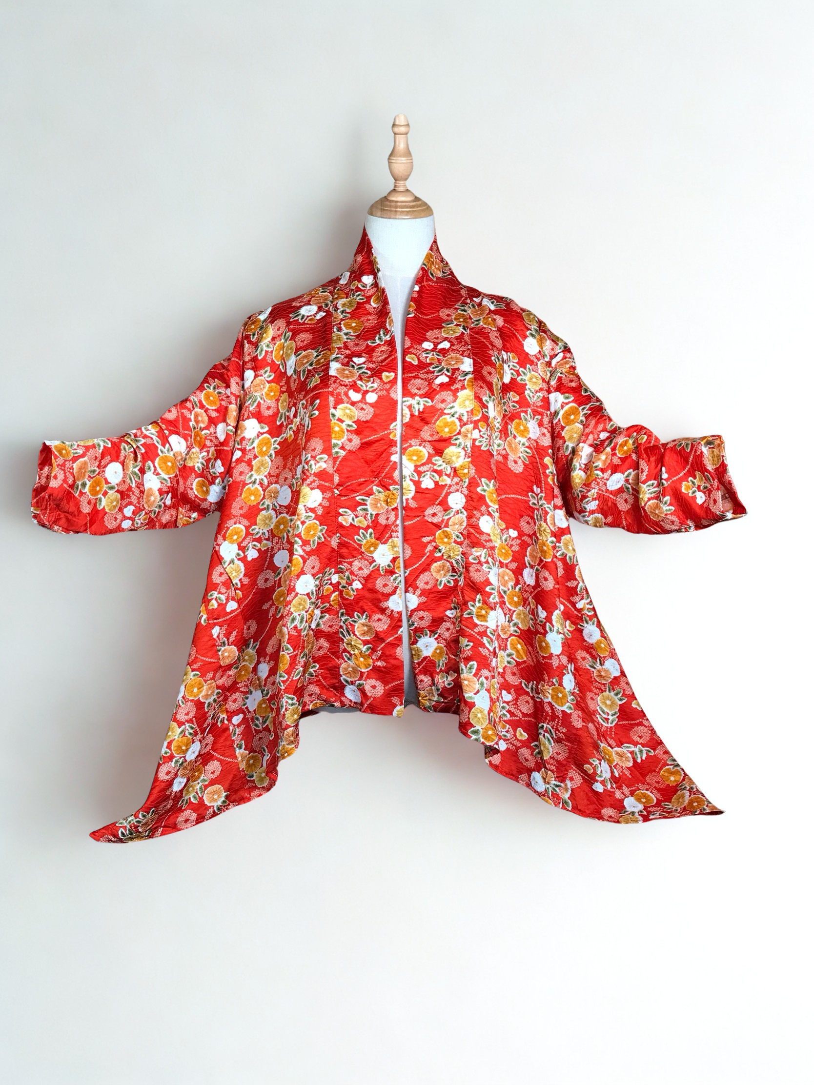 We are creating the kimono jacket from exquisite high-quality unused silk kimono rolls which originally sold for US$1,000-$6,000 or more. They were made by a variety of traditional techniques, including hand-painting, hand-weaving, and Katazome.
