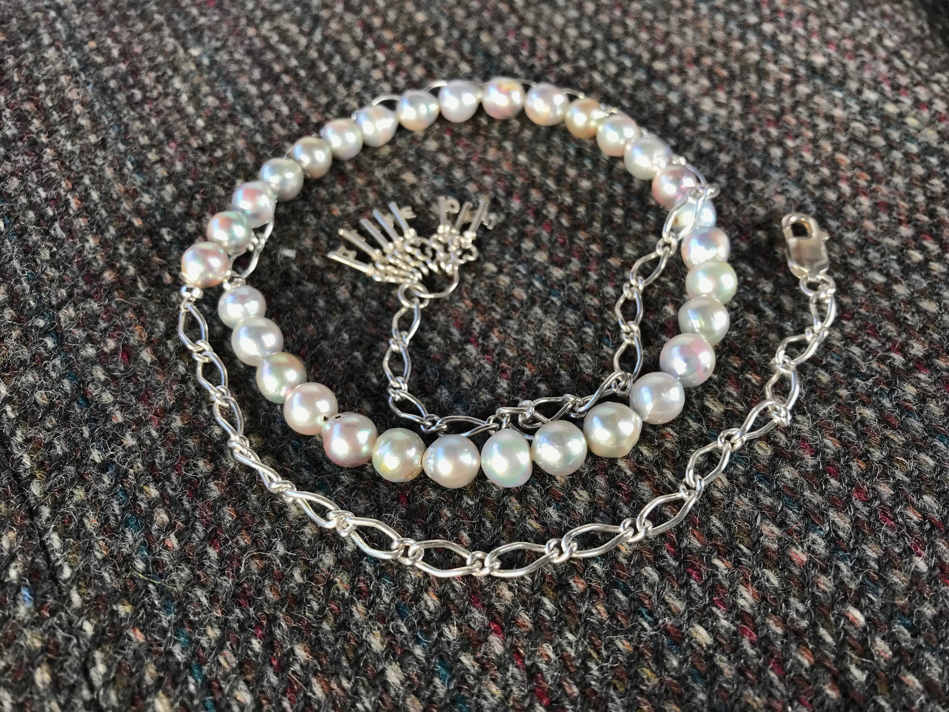 This is a silver-blue color Japanese Akoya salt-water cultured pearl necklace and silver 925 chain, with a silver charm which was made by a craftsman in Birmingham, UK.